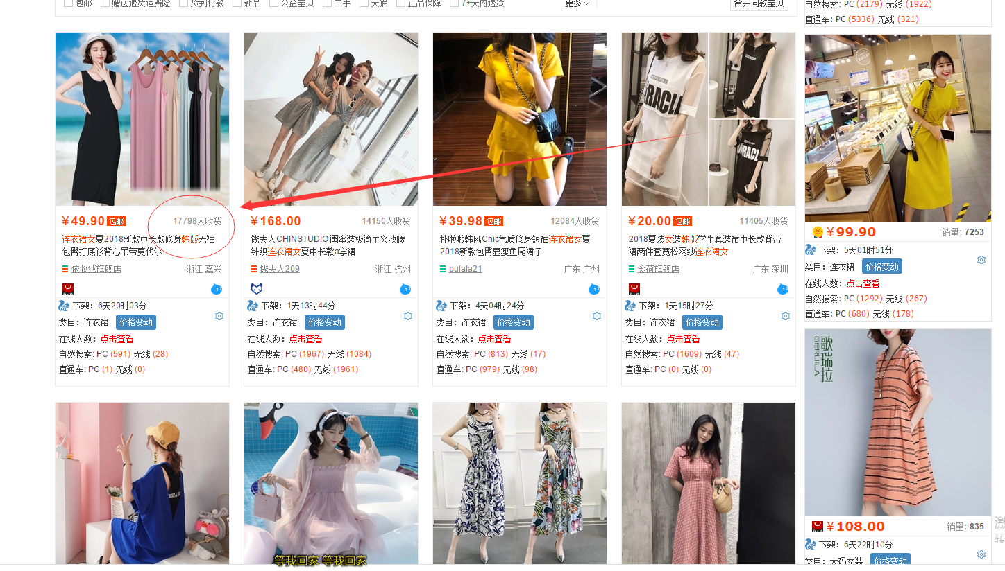1.搜索潜力:是否能够提升起来,需要我们去看一下行业上限,行业上限越高说明这个款搜素潜力越大,那么行业上限怎么看呢?其实非常简单,直接去淘宝搜索产品,看销量高低之间的差距,就是我们的行业上限,差距越大行业上限越高,越值得去操作。